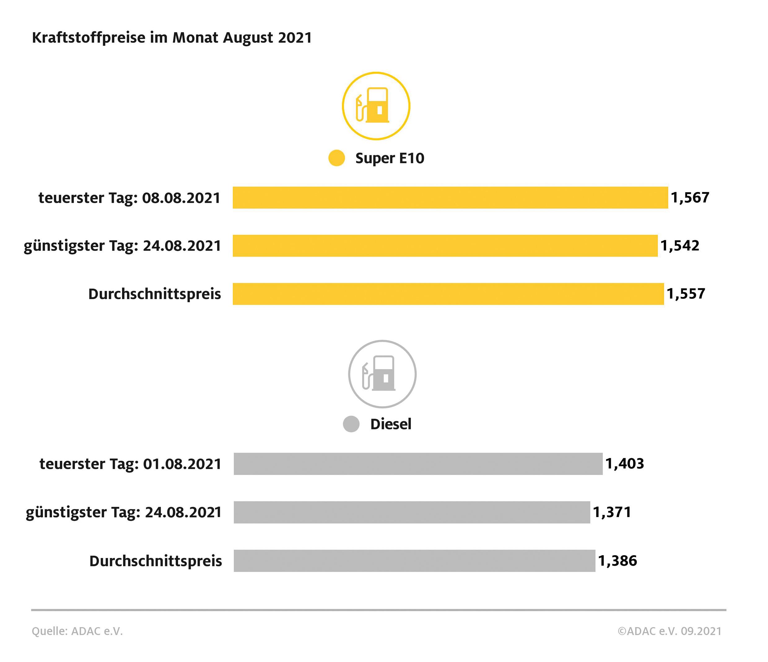 Teuerster Tag zum Tanken war bei Benzin der 8. August. Ein Liter kostete im Tagesmittel 1,567 Euro. Dieser Preis markierte gleichzeitig auch den vorläufigen Jahreshöchststand. Auch bei Diesel fielen teuerster Tag des Monats und des Jahres zusammen: Am 1. August mussten Diesel-Fahrer mit einem Literpreis von 1,403 Euro einen neuen Jahresrekord hinnehmen.