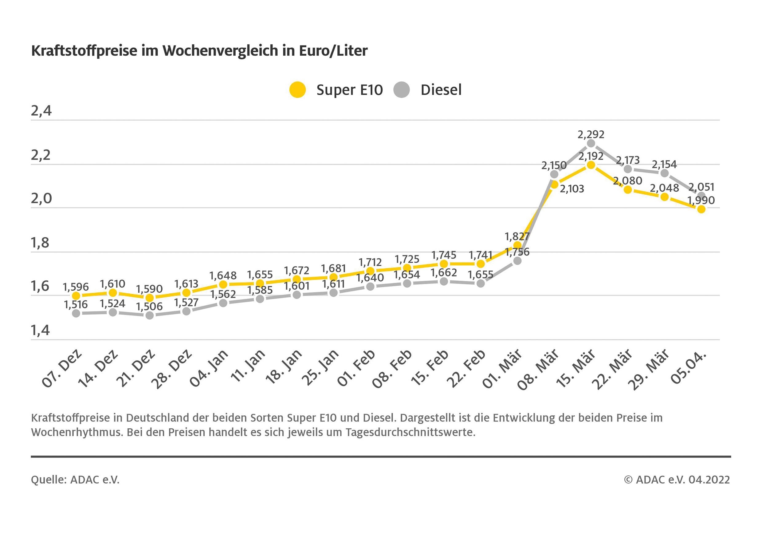 München (ots) – Auch wenn sich die Situation an den Zapfsäulen weiter entspannt hat – Tanken ist nach wie vor im Vergleich zum Rohölpreis viel zu teuer. Wie die aktuelle ADAC Auswertung der Kraftstoffpreise zeigt, kostet ein Liter Super E10 derzeit im bundesweiten Mittel 1,990 Euro. Gegenüber der Vorwoche ist dies ein Rückgang um 5,8 Cent. Deutlich günstiger als vor einer Woche ist Diesel-Kraftstoff. Er kostet im Schnitt 2,051 Euro und ist damit um 10,3 Cent günstiger. In den vergangenen Tagen hat sich der Preisrückgang jedoch nicht mehr fortgesetzt, die Preise stagnieren seit Samstag.