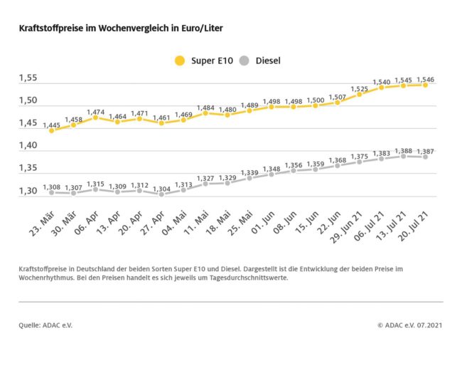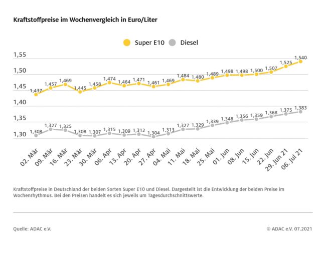 München (ots) Der Anstieg der Kraftstoffpreise hat sich auch in dieser Woche fortgesetzt. Ein Liter Super E10 kostet inzwischen 1,540 Euro, ein Liter Diesel 1,383 Euro. Dies zeigt die aktuelle ADAC Auswertung der Kraftstoffpreise in Deutschland. Damit ist der Benzinpreis binnen Wochenfrist um 1,5 Cent gestiegen, Diesel hat sich um 0,8 Cent verteuert. Der Dieselpreis ist…