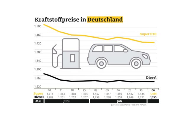München (ots) Der Rückgang der Kraftstoffpreise setzt sich fort. Autofahrer konnten im Juli den zweiten Monat in Folge billiger tanken. Laut der monatlichen Marktauswertung des ADAC kostete ein Liter Super E10 im Monatsmittel 1,448 Euro und damit 3,0 Cent weniger als im Juni. Diesel verbilligte sich gegenüber dem Vormonat um 0,9 Cent auf durchschnittlich 1,252 Euro…