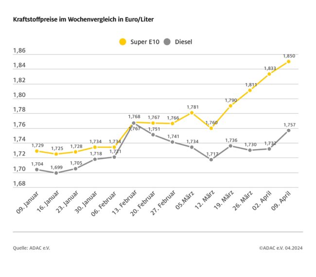 ADAC: Kraftstoffpreise steigen weiter – Benzin steigt gegenüber der Vorwoche um 1,7 Cent – Diesel um 2,5 Cent je Liter teurer
