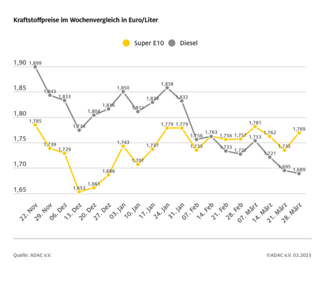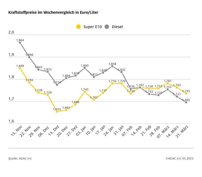 ADAC: Diesel auf neuem Jahres-Tiefststand – Benzinpreis 2,7 Cent niedriger als in der Vorwoche – Diesel 2,6 Cent billiger – Preisdifferenz zwischen beiden Sorten nur vier Cent