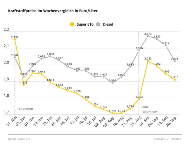 München (ots) Kraftstoffpreise im Wochenvergleich Quelle: ADAC e.V.   Erstmals seit fünf Wochen ist der Preis für Diesel-Kraftstoff wieder unter die Marke von zwei Euro gesunken. Wie die aktuelle ADAC Auswertung der Kraftstoffpreise in Deutschland zeigt, kostet ein Liter Diesel im bundesweiten Schnitt 1,996 Euro und damit 2,5 Cent weniger als vor einer Woche. Zuletzt lag…