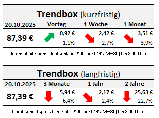 Die genannten Heizölpreise beziehen sich stets auf den deutschlandweiten Durchschnittspreis bei einer Bestellung von 3.000 Liter Heizöl Standard schwefelarm inklusive 19% MwSt. Außerdem fallen durch Transportkosten die Preise regional unterschiedlich aus. Stand der Preise 20.10.2025