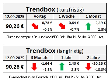 Die genannten Heizölpreise beziehen sich stets auf den deutschlandweiten Durchschnittspreis bei einer Bestellung von 3.000 Liter Heizöl Standard schwefelarm inklusive 19% MwSt. Außerdem fallen durch Transportkosten die Preise regional unterschiedlich aus. Stand der Preise 12.9.2025