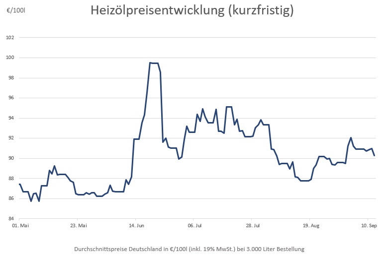 In der vergangenen Woche war der Freitag mit 90,26 Euro für 100 Liter der günstigste Tag für den Heizölkauf. Der Donnerstag wiederum war mit 90,99 Euro der teuerste Tag, um seine Heizölvorräte aufzufüllen.